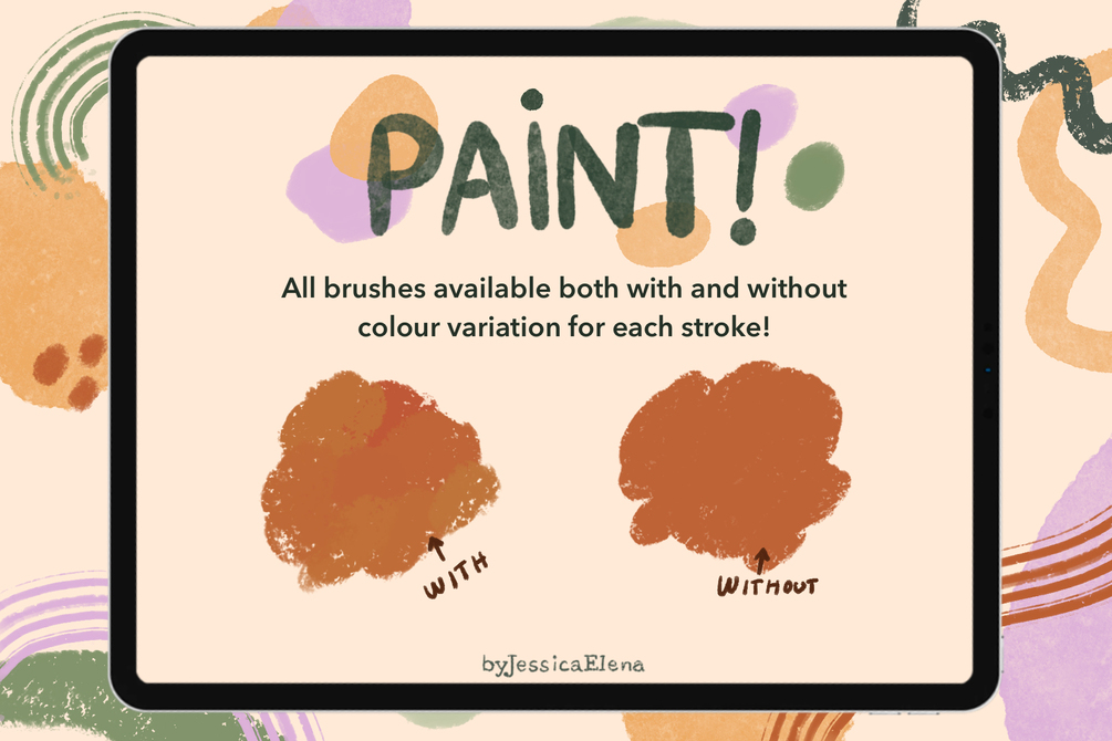 The entire brush pack is available in 2 versions (so it's actually 28 brushes!), one with a gentle colour variation ON for all the brushes, meaning you get a slight colour variation for each new stroke (giving a more natural painterly feel) and one with color variation OFF for more control! I especially enjoy the ones with colour variation - the constant changes (with no added work on your part) really adds so much life to a digital painting!