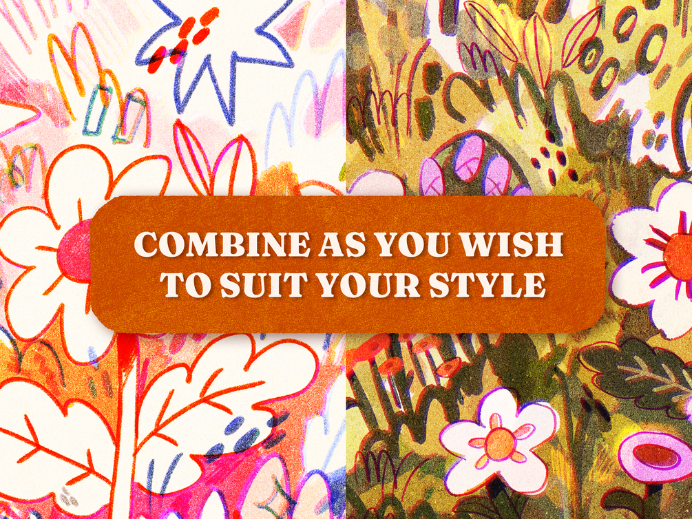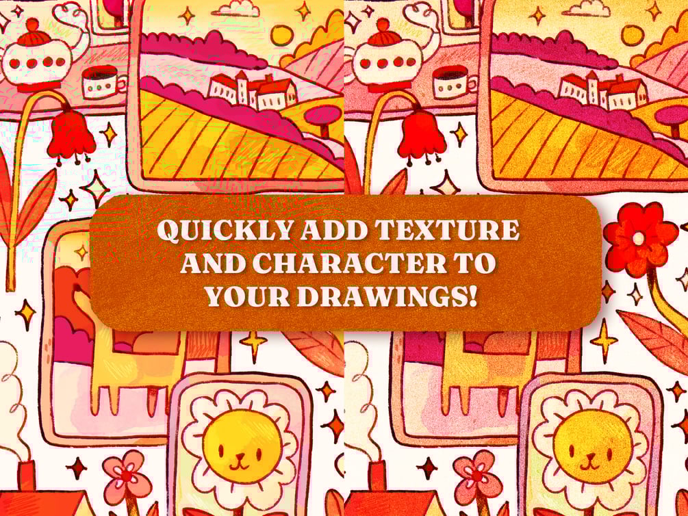 The textures are a neutral grey colour, and setting them to different blending modes (overlay is my favourite!) means you can create lots of grainy texture on top of any drawing or digital image.